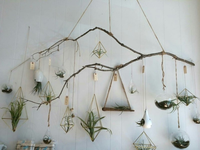 Tanaman di dalam rumah dirangkai dengan cara menggantungkan pot transparan di ranting pohon.